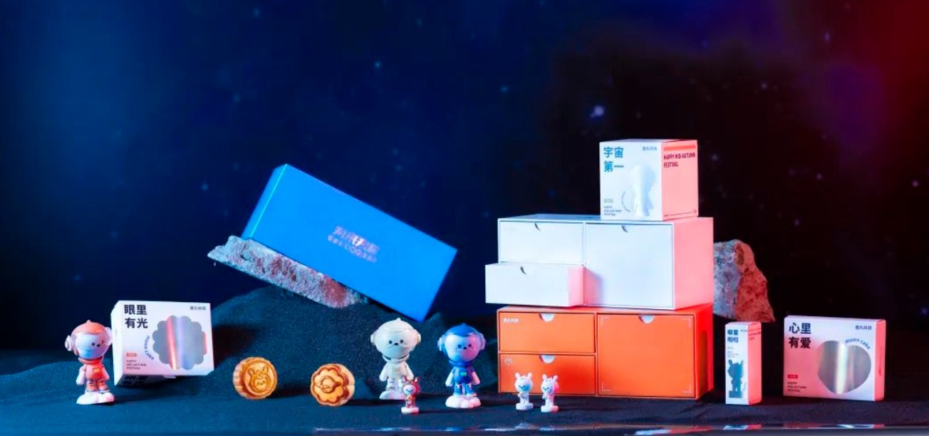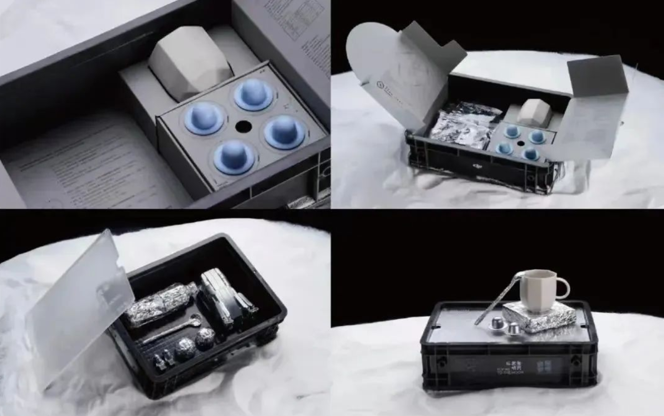 登月行囊共有四樣物品:無人機積木、像素馬克杯、月餅和飛碟咖啡,