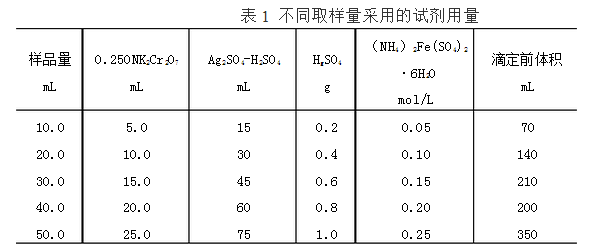7.9 在特殊情況下,需要測定的試料在10.0mL到50.0mL之間,試劑的體積或重量按表1作相應的調整。