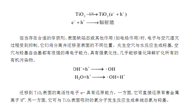 近年來,利用寬禁帶n型半導(dǎo)體制備染料敏化太陽能電池和光催化降解有機物的**氧化技術(shù)引起了人們的極大關(guān)注,并將此技術(shù)應(yīng)用于COD測定中,目前研究較多的有納米ZnO,SnO2和TiO2材料[4]。和前兩者相比,TiO2來源豐富、價格低廉、耐酸堿腐蝕、耐光蝕、化學(xué)穩(wěn)定性好,是一種具有良好應(yīng)用前景的光催化劑。當(dāng)受到能量大于帶隙寬度的紫外光照時,TiO2價帶上的電子受激發(fā)躍遷到導(dǎo)帶,在半導(dǎo)體的導(dǎo)帶和禁帶上分別形成光生電子與空穴對(e−,h+).被激活的電子和空穴可能在TiO2顆粒內(nèi)部或表面重新相遇而發(fā)生湮滅,將能量通過輻射散發(fā)。