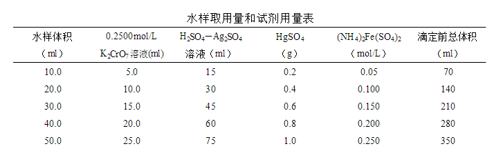 注:①對于化學需氧量高的廢水樣,可先取上述操作所需體積1/10的廢水樣和試劑,與15mm×150mm硬質玻璃試管中,搖勻,加熱后觀察是否變為綠色。如溶液顯綠色,再適當減少廢水取樣量,知道溶液不變綠色為止,從而確定廢水樣分析時應取用的體積。稀釋時,所取廢水樣不得少于5ml,如果化學需氧量很高,則廢水樣應多次逐級稀釋。