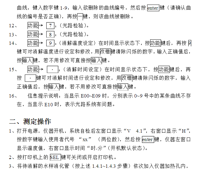 COD快速測定儀(TL-1A) 1.2.2 分光光度計(721) 1.2.3 水浴塑料盆 1.2.4 14ml專用刻度試管及試管架(若干) 1.2.5 1.00ml專用刻度吸管(2只) 1.2.6 5.00ml專用刻度吸管(2只) 1.2.7 吸耳球 1.3 試劑 1.3.1 專用氧化劑 1.3.2 專用催化劑 1.3.3 氯掩蔽劑:稱取20g硫酸汞溶于1:10稀硫酸中,定容**100ml,