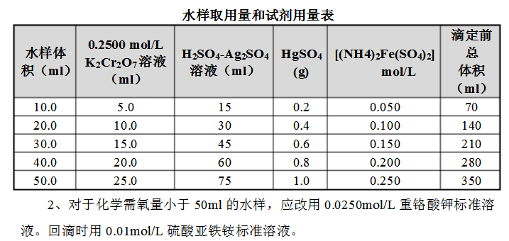 1、水樣取用體積可在10.00-50.00ml范圍內,但試劑用量及濃度需按下表進行相應調整,也可得到滿意的結果