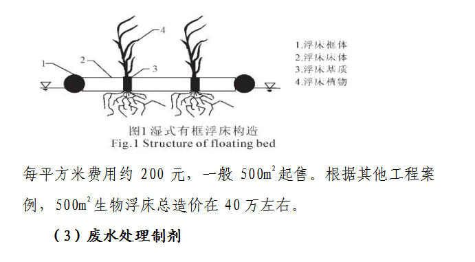 (2)生態(tài)浮床:人工生物浮床技術(shù)是按照自然界自然規(guī)律,人工把水生植物或改良的陸生植物,以浮床作為載體,種植到富營養(yǎng)化水體的水面,通過植物根部的吸收、吸附作用和物種競爭相克機理,消減富營養(yǎng)化水體中的氮、磷及有機物質(zhì),有的根據(jù)植物的吸附特性,可以去除水中重金屬物質(zhì),從而達到凈化水質(zhì)的效果,同時又可營造水上景觀。 一般由四個部分組成:浮床框架、植物浮床、水下固定裝置以及水生植被。