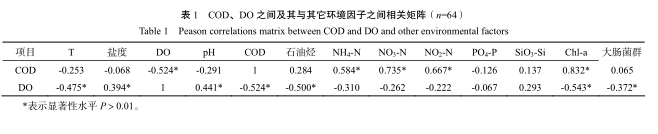 海水中 DO 的主要來源是大氣中氧的溶解,其次來自于海洋生物,尤其是浮游植物光合作用時(shí)所放出的氧。表 1 中,DO 值主要與溫度、pH、COD、石油烴、Chl-a、大腸菌群、鹽度等指標(biāo)顯著相關(guān),相關(guān)系數(shù)分別為-0.475、0.441、-0.524、-0.5、-0.543、-0.372、0.394。DO 與溫度明顯負(fù)相關(guān), 符合水體中溶解氧與溫度分布呈反比例的一般規(guī)律(見表 1) 。DO 與 pH 顯著正相關(guān),則反映了有機(jī)污染物氧化分解,消耗氧氣,并導(dǎo)致 pH 值下降的過程。DO 與石油烴明顯負(fù)相關(guān),可能與石油烴降解耗氧及石油烴污染易在水面形成油膜,影響水-氣界面氧氣交換的作用有關(guān)。盡管亞熱帶河口海區(qū)由于受溫度、光照、及高營(yíng)養(yǎng)鹽含量等因素影響,往往具有較高的初級(jí)生產(chǎn)力(高 Chl-a值) ,浮游植物在光合作用中釋放出大量氧氣,但營(yíng)養(yǎng)鹽水平較高的海區(qū),其耗氧污染物負(fù)荷也較高,污染物降解耗氧速度遠(yuǎn)大于生物作用生成氧氣的速度, 這也是 DO 與 Chl-a 呈現(xiàn)負(fù)相關(guān)的主要原因。大腸菌群指標(biāo)常用來表征微生物降解有機(jī)物能力,有機(jī)污染程度越高,大腸菌群則越高,這也解釋了 DO 與大腸菌群顯著負(fù)相關(guān)的主要原因 [21] 。DO 與鹽度顯著正相關(guān),主要為鹽度越高,則越靠近外海,其污染負(fù)荷越小,而 DO 含量則越高。