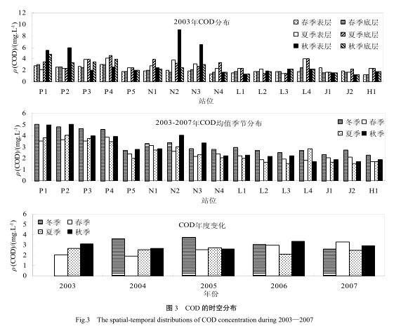 2003 - 2007 年間,廣州海域水體中 COD 的變化范圍為 0.76~9.12 mg·L -1 ,平均值為 2.83 mg·L -1 ;污染指數范圍為 0.38~4.56,均值為 1.42,超標率為79.8%,其 COD 質量濃度均值低于長江口海域 [7] 、大遼河口 [8] ,而略高于廣西北部灣 [9] 及膠州灣 [10] ,此外,與珠江口其它海域如伶仃洋海域 [11-12] 、大亞灣海域 [13] 相比,廣州海域 COD 質量濃度明顯偏高。 季節分布上(見圖 3) ,枯水期 COD 質量濃度(冬季和秋季)明顯高于豐水期(春季和夏季) ,質量濃度均值比豐水期高約 20%。冬季**高(均值為 3.27mg·L -1 ) ,秋季(均值為 2.95 mg·L -1 )其次,春季(均值為 2.57 mg·L -1 )和夏季**低(均值 2.52 mg·L -1 ) ,季節間除春季與夏季間差異較小外,其它季節間差異明顯。廣州海域為珠江入海的主要通道,COD 質量濃度受珠江徑流影響明顯,季節間差異受降雨量影響較大,豐水期降雨量遠大于枯水期,COD 質量濃度受稀釋作用則較枯水期低。 春夏季 COD 質量濃度差異不大,則可能除了徑流量(降雨量)因素外,還與生活污水及工農業廢水季節排放狀況有關。